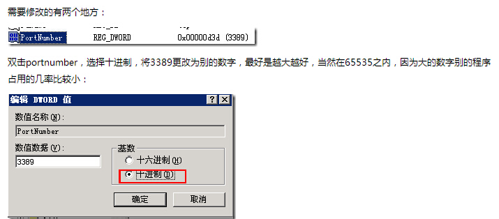3、更改3389遠(yuǎn)程登錄端口 Windows默認(rèn)的遠(yuǎn)程登錄端口是3389,有的時(shí)候?yàn)榱税踩紤],需要更改遠(yuǎn)程端口。點(diǎn)擊 開(kāi)始-運(yùn)行-輸入 regedit 打開(kāi)注冊(cè)表編輯器,由于注冊(cè)表上有很多信息,最簡(jiǎn)單的方法尋找需要修改端口的地方,鍵盤(pán)ctrl+F,彈出搜索框,輸入Portnumber進(jìn)行查找,可能會(huì)搜到幾處選項(xiàng),注意查找值為3389的名稱。![]() 需要修改的地方有兩個(gè)-雙擊portnumber,選擇十進(jìn)制,將3389更改為別的數(shù)字,最好是越大越好,當(dāng)然在65535之內(nèi),因?yàn)榇蟮臄?shù)字別的程序占用的幾率比較小。