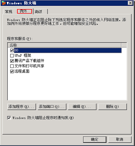 4、防火墻安全配置 修改完成后,一定要查看本地的防火墻用沒(méi)有打開(kāi),如果打開(kāi),需要在防火墻中將修改后的端口添加到例外。右鍵網(wǎng)上鄰居-選擇屬性-網(wǎng)絡(luò)連接-右鍵本地連接-屬性-高級(jí)-設(shè)置,打開(kāi)windows防火墻,選擇例外選項(xiàng):![]()