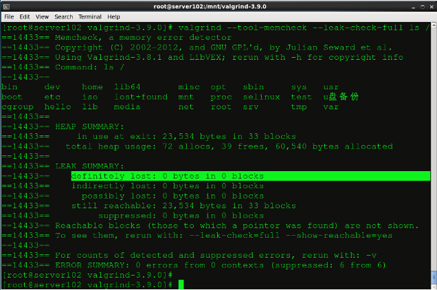 完成之后我們就可以對(duì)系統(tǒng)中的程序進(jìn)行檢測(cè)了,首先我們用ls顯示根目錄下的文件,ls命令是沒有內(nèi)存泄漏的: