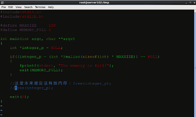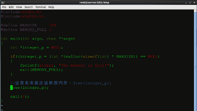 為了體現(xiàn)valgrind 的檢錯(cuò)功能,我們故意編寫一個(gè)只malloc沒有free的C程序: