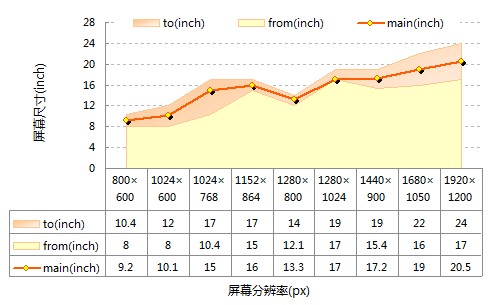 計(jì)算不同顯示器上的字號(hào)大小 用屏幕的物理寬度除以像素寬度,就可以得到每個(gè)像素的寬度。然后用指定的文字物理大小除以這個(gè)數(shù),就可以得到在不同分辨率下所需的字號(hào)。例如要顯示4.32mm見方的文字,各分辨率下分別需要如下的字號(hào)(對(duì)筆記本和臺(tái)式機(jī)分別統(tǒng)計(jì)):![]() 不同分辨率下需要的字號(hào) 可以看出筆記本和臺(tái)式機(jī)的尺寸相差很大,為方便使用,使用各分辨率的主流尺寸或平均尺寸計(jì)算出指定字號(hào)在每個(gè)分辨率下所需的字號(hào)。(下圖去掉了基本只用在筆記本上的那些分辨率),以4.32mm、3.77mm、3.25mm為例(17寸1280*1024分辨率下的16、14和12號(hào)字):