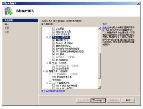 第一步,在“服務(wù)器管理器”窗口中,展開(kāi)“角色”節(jié)點(diǎn),選擇“Web 服務(wù)器(IIS)”,單擊“添加角色服務(wù)”,顯示如下圖所示的“選擇角色服務(wù)”窗口。在“安全性”選項(xiàng)區(qū)域中,可選擇欲安裝的身份驗(yàn)證方式。