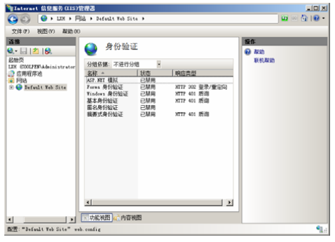 第二步,安裝完成后,打開(kāi) IIS 管理器,再打開(kāi)“身份驗(yàn)證”窗口,所經(jīng)安裝的身份驗(yàn)證方式顯示在列表中,并且默認(rèn)均為禁用狀態(tài),如下圖所示。