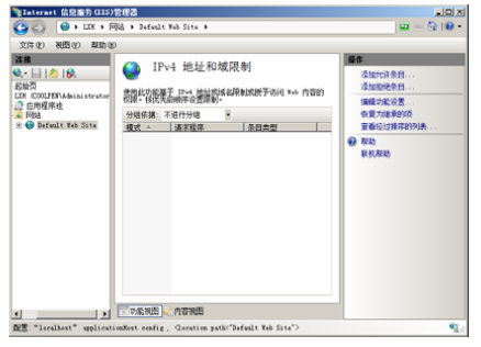 第一步,打開(kāi) IIS 管理器,選擇欲限制的 Web 站點(diǎn),雙擊“IPv4 地址和域限制”圖標(biāo),顯示如下圖所示的“IPv4 地址和域限制”窗口。
