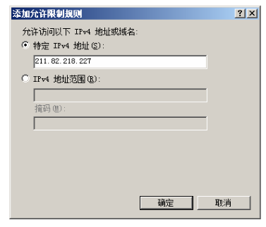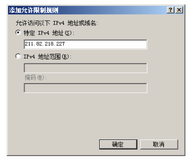 第二步,在右側(cè)“操作”任務(wù)欄中,單擊“添加允許條目”鏈接,顯示如下圖所示的“添加允許限制規(guī)則”窗口。如果要添加一個(gè) IP 地址,可點(diǎn)選“特定 IPv4 地址”單選按鈕,并輸入允許訪(fǎng)問(wèn)的 IP 地址即可;如果要添加一個(gè) IP 地址段,可點(diǎn)選“IPv4 地址范圍”單選按鈕,并輸入 IP 地址及子網(wǎng)掩碼即可。
