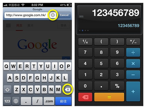 我們再來看看 iOS 中的“刪除”設(shè)計,下圖以 Safari 瀏覽器地址輸入時界面為例(其他搜索界面類似),兩個按鈕分別標出(下圖左):