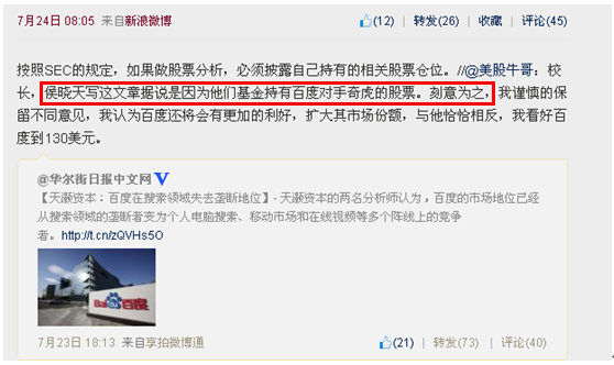 看完我一直不明白候小天為什么這么寫,憑他們的水平應(yīng)該不會把問題看得這么片面扭曲吧,后來看了微博上@安普若-安校長的微博,就是上面的截圖,什么都明白了:原來人家持有奇虎的股份呀,怪不得要絞盡腦汗來唱衰百度,可以理解,利益至上嘛。