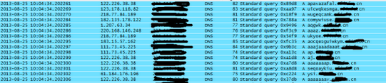為了最大限度的降低命中DNS緩存的可能,一般攻擊者在構(gòu)造攻擊包時(shí)都會隨機(jī)偽造查詢源IP地址、偽造隨機(jī)源端口,偽造隨機(jī)查詢ID以及待解析的域名。從筆者獲取到本次.CN攻擊的數(shù)據(jù)包來看(見下圖4),攻擊者就是把經(jīng)過特殊構(gòu)造的海量的隨機(jī)域名的查詢請求直接發(fā)給了.CN的根服務(wù)器,也就是上文中提到的變域名攻擊方式。不過,筆者認(rèn)為其中可能還混合有其他一些諸如UDP洪水、DNS放大和DNS僵尸查詢等DDoS攻擊,最終的目的就是讓被攻擊網(wǎng)絡(luò)的鏈路帶寬超出服務(wù)的帶寬,讓目標(biāo)機(jī)或集群處理能力超出極限,從而達(dá)到DNS解析不能提供正常服務(wù)的狀態(tài)。
