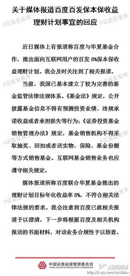 10月23日消息,據(jù)中國(guó)證監(jiān)會(huì)辦公廳新聞辦官方微博消息,證監(jiān)會(huì)表示,媒體報(bào)道所稱百度與華夏基金推出的理財(cái)計(jì)劃目標(biāo)年化收益率8%,不符合相關(guān)法律法規(guī)要求。證監(jiān)會(huì)注意到百度已就相關(guān)報(bào)道予以澄清,下一步將根據(jù)百度及相關(guān)機(jī)構(gòu)報(bào)送的書(shū)面材料,對(duì)該業(yè)務(wù)合規(guī)性予以檢查。