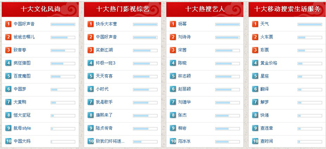 百度2013年搜索風(fēng)云榜包括8個(gè)主榜單和16個(gè)特色榜單,其中主榜單囊括2013十大搜索熱詞、十大上升最快事件、十大話(huà)題人物、十大網(wǎng)絡(luò)流行語(yǔ)、十大文化風(fēng)尚、十大熱門(mén)影視綜藝、十大熱搜藝人、十大移動(dòng)搜索生活服務(wù)。