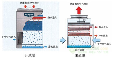 冷卻水通過盤管間接接觸,水槽內的水噴淋在盤管上蒸發(fā)(潛熱)帶走熱量。
