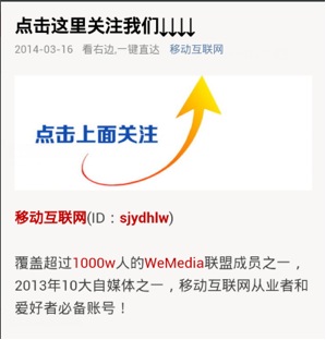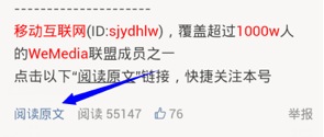 “移動(dòng)互聯(lián)網(wǎng)”賬號(hào)通常也會(huì)在頁(yè)面底部提示大家點(diǎn)擊閱讀原文進(jìn)行關(guān)注,其實(shí)也是利用這樣的方式;只是跳轉(zhuǎn)了一個(gè)頁(yè)面,比如點(diǎn)擊閱讀原文后跳轉(zhuǎn)到這么一個(gè)提示頁(yè)面: