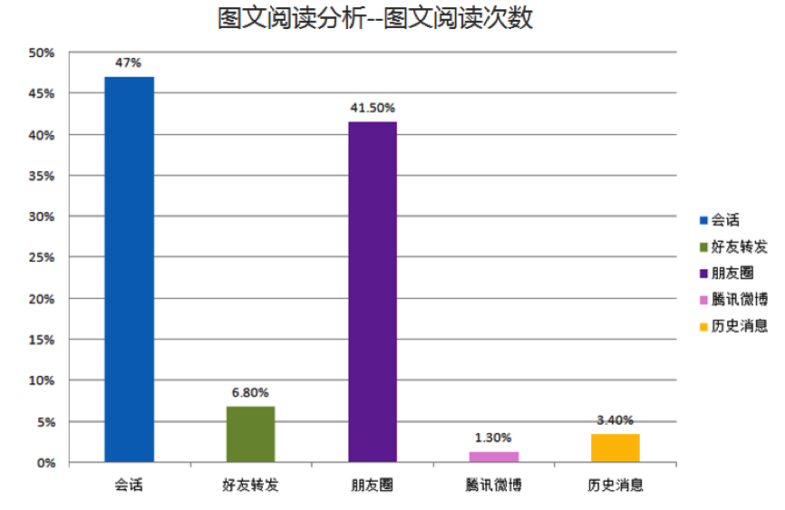 從以上兩個(gè)柱狀圖可以看出通過(guò)會(huì)話(huà)(通過(guò)公眾號(hào)下發(fā)的界面)和朋友圈,是圖文閱讀人數(shù)和次數(shù)的主要來(lái)源渠道,好友轉(zhuǎn)發(fā)和歷史消息其次,而騰訊微博轉(zhuǎn)化作用可以忽略不計(jì)(也跟賬號(hào)是否在騰訊微博宣傳和相應(yīng)微博粉絲數(shù)有關(guān))。