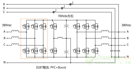 而到上世紀(jì)90年代,第三代溝槽型IGBT面世,其耐壓能力提升至1200V,促使了UPS技術(shù)的革新。通過整流側(cè)高頻升壓電路將母線電壓提升至700V左右,逆變器輸出電壓可以做到380V,輸出變壓器得以取消。而這種整流逆變電路都工作在高頻(幾kHz以上)且沒有輸出變壓器的UPS就被稱為高頻UPS。圖-2所示為一典型的高頻機(jī)拓?fù)洹?