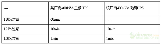 第一,過載能力強(qiáng),抗負(fù)載沖擊能力強(qiáng)。過載能力是IEC62040-3中要求標(biāo)稱的關(guān)鍵指標(biāo)之一,其強(qiáng)弱可通過實(shí)際數(shù)據(jù)來衡量。表-1所示為同一廠商的工頻機(jī)與高頻機(jī)過載能力,由表-1可知,兩類機(jī)型過載能力并沒有區(qū)別。