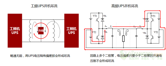 實(shí)際上,變壓器的設(shè)計(jì)反而增大了環(huán)流的風(fēng)險(xiǎn)。圖-3所示為兩類機(jī)型的環(huán)流路徑。工頻機(jī)UPS的并聯(lián)就是變壓器的直接并聯(lián),整條回路上沒有器件限制,電壓的偏差很容易產(chǎn)生環(huán)流。而高頻機(jī)的環(huán)流路徑上具備多個(gè)二極管,小于2V的電壓差根本形不成環(huán)流。