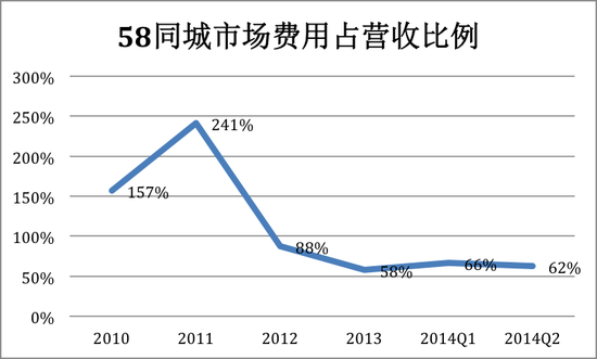 巨額的廣告投放,數(shù)千人的線下業(yè)務(wù)員團隊使58同城市場費用占營收的比例居高不下。2011年市場費用突破1億美元,相當于營收的241%,此后有所回落。2013年及2014年前六個月,基本穩(wěn)定在營收的60%左右。