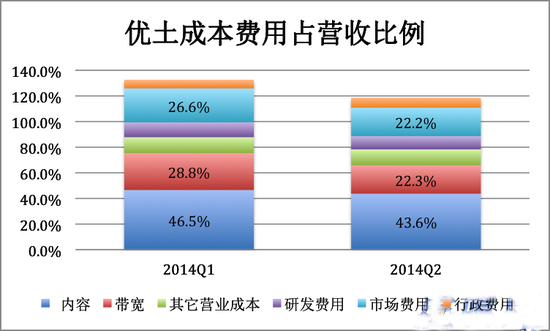 優(yōu)酷土豆的三大負擔是內(nèi)容、帶寬及市場費用,2014年Q2分別相當于營收的43.6%、22.3%和22.2%。