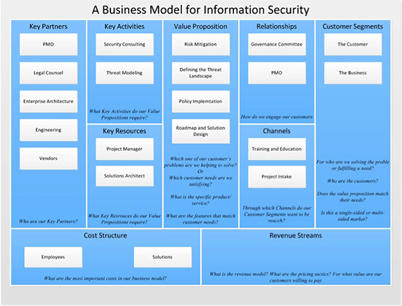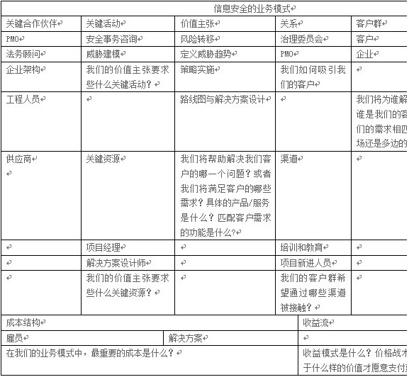 業(yè)務(wù)價值主張從本質(zhì)上來說是動態(tài)的,而保護計劃業(yè)務(wù)模式則是相對靜態(tài)的。關(guān)鍵資源是可控因素(例如,團隊),它提供了價值主張。關(guān)鍵合作伙伴是那些在企業(yè)內(nèi)部你希望他們提供業(yè)務(wù)驅(qū)動因素的人。圖2顯示了一個可跨多個行業(yè)使用的安全計劃的業(yè)務(wù)模式。