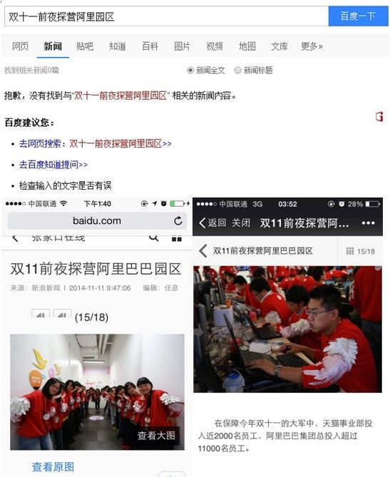 3、網(wǎng)上已經(jīng)搜不到新浪原發(fā)的“雙十一前夜探營阿里園區(qū)”的專題圖片新聞,只能搜到其他媒體轉(zhuǎn)載的,請問貴公司真的是很有誠意在和我們溝通嗎?