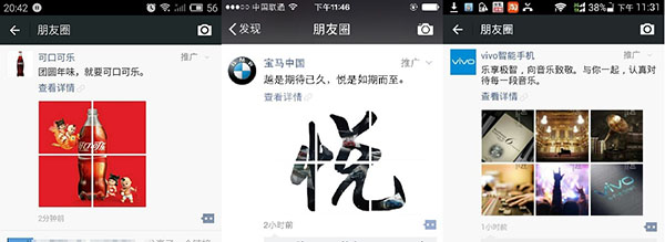 “刷了半天發(fā)現(xiàn)是個(gè) Vivo 的廣告,感覺(jué)一下子不好了!”近日微信朋友圈信息流廣告首批上線(xiàn),寶馬中國(guó)、Vivo 智能手機(jī)和可口可樂(lè)的廣告出現(xiàn)在每個(gè)人的朋友圈信息流里,但是每個(gè)人只有一個(gè)。所以瞬間全體微信用戶(hù)被貼上了三個(gè)標(biāo)簽:刷出寶馬廣告的,刷出 vivo 廣告的和刷出可口可樂(lè)廣告的。