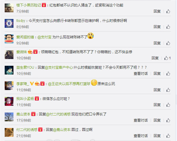 在支付寶官方微博的評(píng)論中,不少網(wǎng)友都表示目前支付寶的轉(zhuǎn)賬功能已經(jīng)無法使用了,在網(wǎng)絡(luò)連接正常的情況下,進(jìn)行轉(zhuǎn)賬等操作時(shí),會(huì)出現(xiàn)“系統(tǒng)錯(cuò)誤”、“網(wǎng)絡(luò)不給力”等字樣,導(dǎo)致操作失敗。不過紅包功能卻能正常使用。也有網(wǎng)友表示,他們的紅包功能也出現(xiàn)問題,整個(gè)支付寶基本上處于癱瘓狀態(tài)。