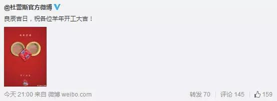 用杜杜做了一個(gè)羊頭的造型,開工大吉,簡(jiǎn)單直接,惡搞元素是杜杜一貫作風(fēng),文案上沒能發(fā)揮極致,此條略顯平淡。