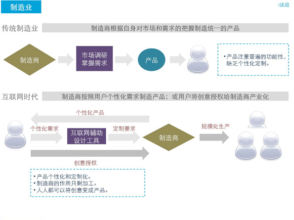 傳統(tǒng)的制造業(yè)都是封閉式生產(chǎn),由生產(chǎn)商決定生產(chǎn)何種商品。生產(chǎn)者與消費(fèi)者的角色是割裂的。但是在未來,互聯(lián)網(wǎng)會瓦解這種狀態(tài),未來將會由顧客全程參與到生產(chǎn)環(huán)節(jié)當(dāng)中,有用戶共同決策來制造他們想要的產(chǎn)品。也就是說,未來時代消費(fèi)者與生產(chǎn)者的界限會模糊起來,而同時傳統(tǒng)的經(jīng)濟(jì)理論面臨崩潰。這也是注定要誕生的C2B全新模式。