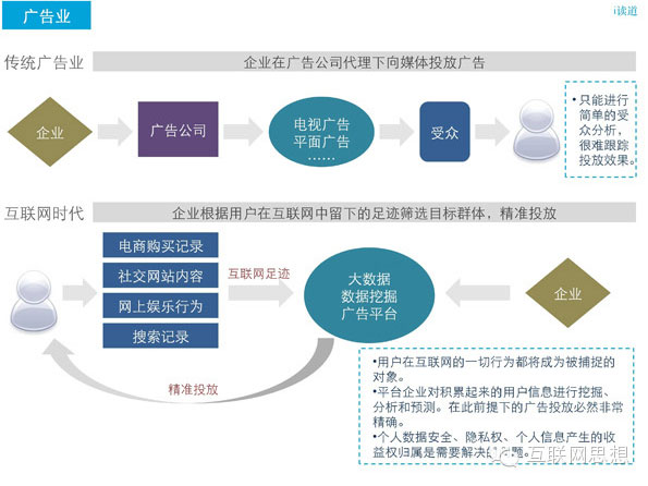 不僅在搜索處如此精準(zhǔn),在網(wǎng)站聯(lián)盟投放也講究精準(zhǔn)。只要各位在百度,谷歌,淘寶搜索過相應(yīng)商品關(guān)鍵詞后進(jìn)入有這些網(wǎng)站聯(lián)盟的網(wǎng)站,該網(wǎng)站廣告處都會出你所搜索過的產(chǎn)品現(xiàn)相關(guān)廣告。精準(zhǔn)之程度,對比傳統(tǒng)廣告業(yè)可謂空前。這種做法的本質(zhì)其實(shí)就是一種大數(shù)據(jù)思維