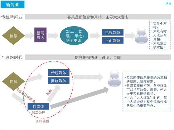 傳統(tǒng)新聞業(yè)被寡頭壟斷,在這樣一種壟斷之下,實(shí)際上是在壟斷真相。自媒體,以及小微媒體可以說是隨著互聯(lián)網(wǎng)發(fā)展進(jìn)程的必然產(chǎn)物?;ヂ?lián)網(wǎng)進(jìn)化最大的特點(diǎn)就是,透明!透明!再透明!??抡f過話語的本質(zhì)就是權(quán)力意志,如果說新聞業(yè)是話語霸權(quán)的主導(dǎo)者,那么自媒體就是對話語霸權(quán)的解構(gòu),使得話語權(quán)力回歸到每一個有話語權(quán)的言說者身上。