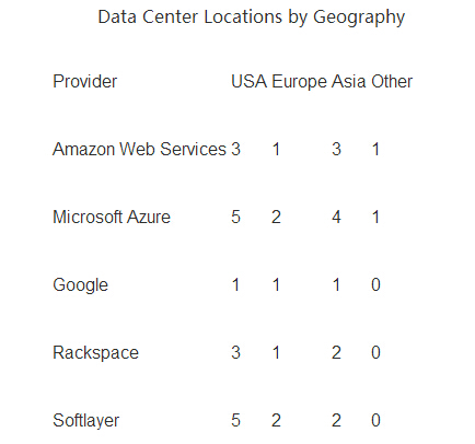 Azure以12個(gè)區(qū)域領(lǐng)先,接著是Softlayer的9個(gè),Amazon8個(gè),Rackspace6個(gè)。Google比較落后,只有3個(gè)。