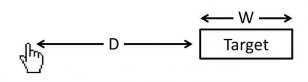 定律內(nèi)容:從一個(gè)起始位置移動(dòng)到一個(gè)最終目標(biāo)所需的時(shí)間由兩個(gè)參數(shù)來(lái)決定,到目標(biāo)的距離和目標(biāo)的大小(上圖中的 D與 W),用數(shù)學(xué)公式表達(dá)為時(shí)間 T = a + b log2(D/W+1)。