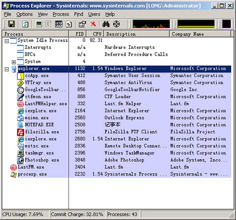 Process Explorer - Process Explorer是一款免費的進程監(jiān)視工具,功能比Windows自帶的任務(wù)管理器要強大的多,不僅可以監(jiān)視、暫停、終止進程,還可以查看進程調(diào)用的DLL文件,是預(yù)防病毒、查殺木馬的好幫手。