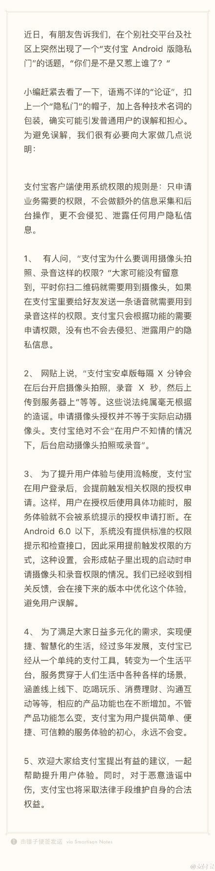 支付寶方面今日通過官方微博發(fā)表回應(yīng)稱,個(gè)別社交平臺(tái)的“支付寶Android版隱私門”話題,用語焉不詳?shù)摹罢撟C”,扣上一個(gè)“隱私門”的帽子,加上各種技術(shù)名詞的包裝,確實(shí)可能引發(fā)普通用戶的誤解和擔(dān)心。支付寶只申請(qǐng)業(yè)務(wù)需要的權(quán)限,不會(huì)做額外的信息采集和后臺(tái)操作,更不會(huì)侵犯、泄露任何用戶隱私信息。