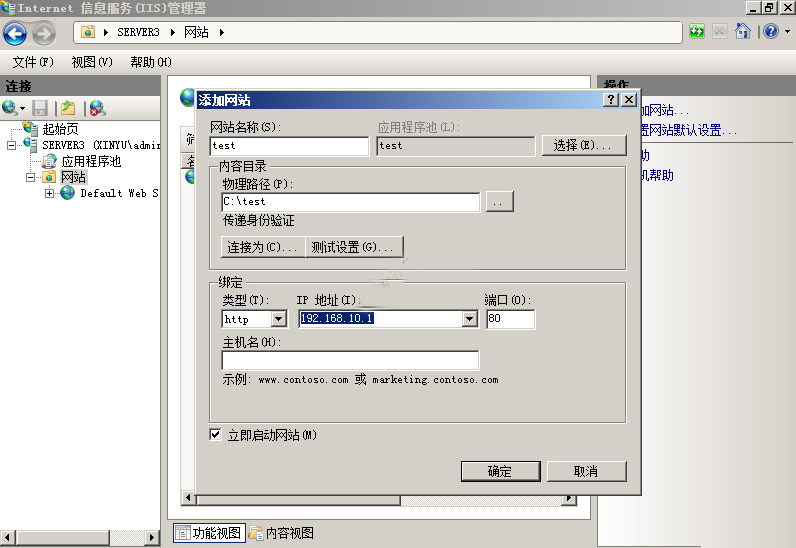 右健,添加網(wǎng)站,在這里,網(wǎng)站名稱我輸入:test,物理路徑選擇你網(wǎng)站的路徑,演示網(wǎng)站放在C盤下的test文件夾;