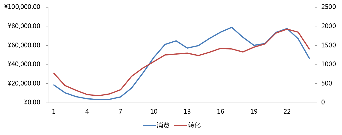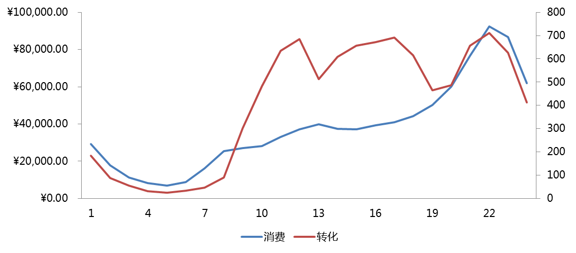 圖1-2(案例客戶某月PC端分時(shí)段消費(fèi)、轉(zhuǎn)化數(shù)據(jù))
