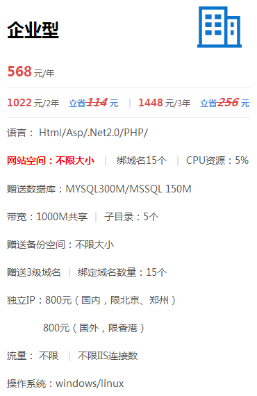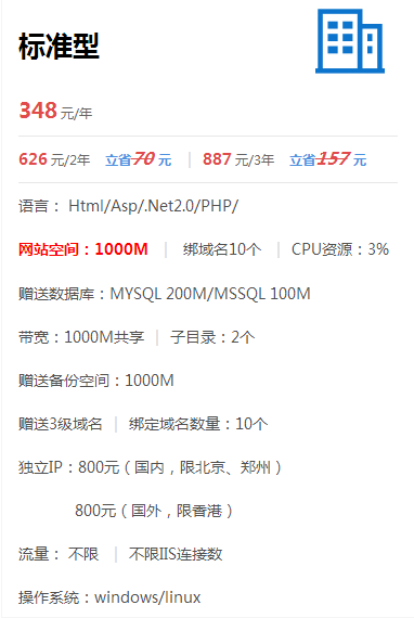 虛擬主機(jī)可分為國(guó)內(nèi)虛擬主機(jī)、免備案虛擬主機(jī),其中免備案虛擬主機(jī)以簡(jiǎn)單、方便、快捷更贏得了客戶的喜愛。免備案虛擬主機(jī)開通即可使用,不限制IIS流量,讓您的網(wǎng)站更暢通。采用DELL高配服務(wù)器,安全穩(wěn)定。7*24小時(shí)全天候客戶服務(wù),更放心。其價(jià)格更加優(yōu)惠,具體如下圖所示: