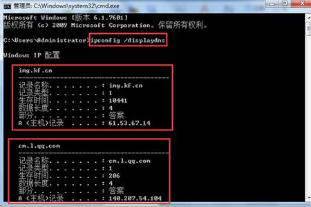 2、在新彈出的命令提示符窗口中輸入“ipconfig /displaydns”,我們便可查看到系統(tǒng)之前使用過的DNS地址,如下圖所示: