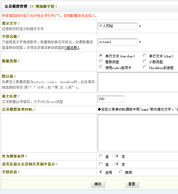 是否在前臺(tái)會(huì)員相關(guān)頁(yè)面中顯示:是否顯示該字段;