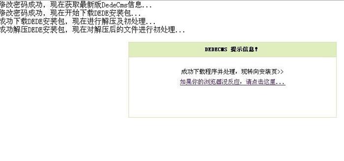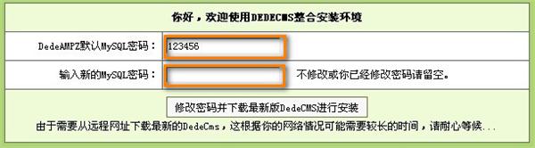 在輸入新的MySQL密碼框中輸入你需要設(shè)置的MySQL密碼點擊“修改密碼并下載最新版DedeCMS運行安裝”執(zhí)行修改MySQL密碼下載最新的DedeCMS安裝程序。等待程序下載,會花幾分鐘的時間 如圖五: