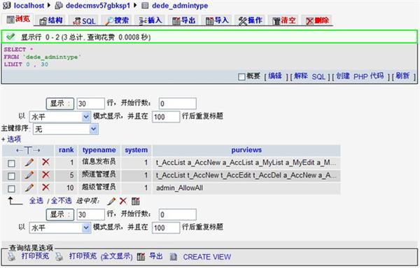 2、其中rank字段是管理權(quán)限,在phpmyadmin查看dede_admintype字段的時(shí)候采用”瀏覽模式“可以看到下面的截圖:
