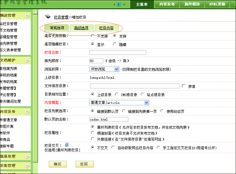 3、欄目交叉:欄目交叉是指一個大欄目與另一個非下級的子欄目出現(xiàn)交叉的情況,相當(dāng)于系統(tǒng)原來的副欄目功能,不過現(xiàn)在改在欄目里預(yù)先設(shè)置好。