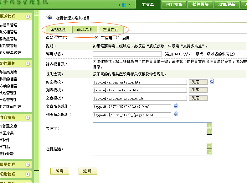 5、欄目模板、欄目生成的HTML和欄目文檔的HTML的命名規(guī)則都是可以手工指定的,可以在高級參數(shù)中填寫這個選項(xiàng)。