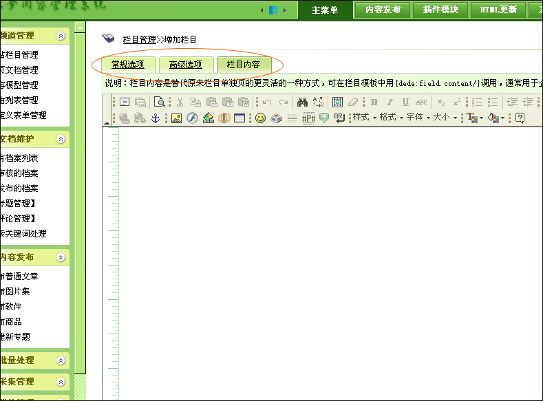 6、欄目內(nèi)容,對于大多數(shù)據(jù)欄目而言,這一項(xiàng)可以不需要填寫,通常如果用于公司簡介等簡單頁面,可以直接在欄目里填寫內(nèi)容,欄目模板中用{dede:field.content/}調(diào)用。