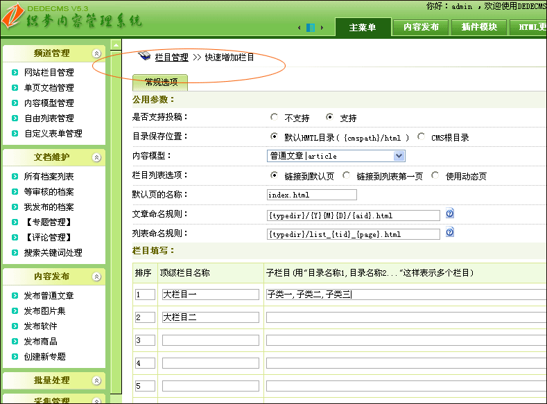 7、快速創(chuàng)建欄目--如果你不需要設(shè)置復(fù)雜的欄目參數(shù),可以用快速創(chuàng)建欄目的模式創(chuàng)建二級的欄目,當(dāng)然如果你要創(chuàng)建更深層次的目錄,則必須單獨(dú)創(chuàng)建。