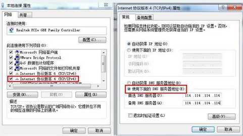 4、這個(gè)時(shí)候可以雙擊“Internet協(xié)議版本4(TCP/IPv4)”,并直接選擇“使用下面的DNS服務(wù)器地址”,并把首選DNS服務(wù)器和備用DNS服務(wù)器設(shè)置為“114.114.114.114”。如下圖: