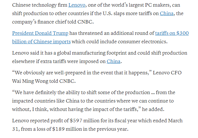 聯(lián)想表示,它在全球都擁有制造業(yè)務(wù),如果美國(guó)對(duì)中國(guó)征收額外關(guān)稅,聯(lián)想可能會(huì)將生產(chǎn)線轉(zhuǎn)移到其它地方。