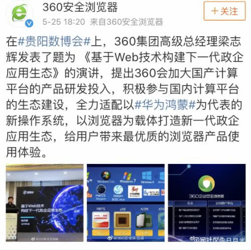 5月25日,在2019中國(guó)國(guó)際大數(shù)據(jù)產(chǎn)業(yè)博覽會(huì)上,360集團(tuán)高級(jí)總經(jīng)理梁志輝發(fā)表了題為 《基于Web技術(shù)構(gòu)建下一代政企應(yīng)用生態(tài)》的演講,提出360會(huì)加大國(guó)產(chǎn)計(jì)算平臺(tái)的產(chǎn)品研發(fā)投入,積極參與國(guó)內(nèi)計(jì)算平臺(tái)的生態(tài)建設(shè),全力適配以#華為鴻蒙#為代表的新操作系統(tǒng),以瀏覽器為載體打造新一代政企應(yīng)用生態(tài),給用戶帶來(lái)最優(yōu)質(zhì)的瀏覽器產(chǎn)品使用體驗(yàn)。