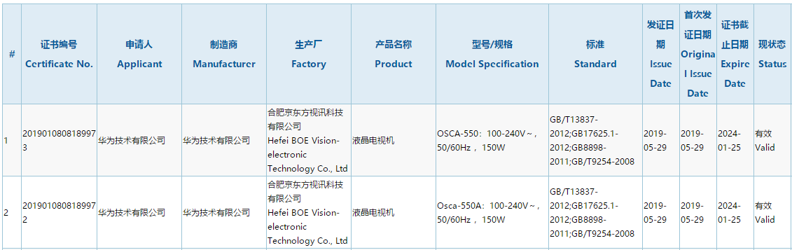 原標(biāo)題:華為兩款液晶電視通過3C認(rèn)證,京東方生產(chǎn)