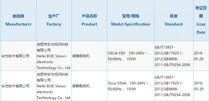 盡管此前華為方面多次公開表示不涉足家電領(lǐng)域,但華為消費(fèi)者業(yè)務(wù)CEO余承東也曾透露會(huì)推出智能大屏設(shè)備。目前看來,OSCA-550和OSCA-550A兩個(gè)型號(hào)的電視很可能對應(yīng)55英寸的智能電視產(chǎn)品。